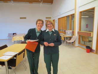 ![]() kokouksen sihteeri Aila Peltonen ja puheenjohtaja, vihreä veli Kalevi Sirén | ![]() Harrastusmerkin saajat Ella ja Aino Laine, Leena Varha, Kirsi Vinnikka ja Ansku Määttä |