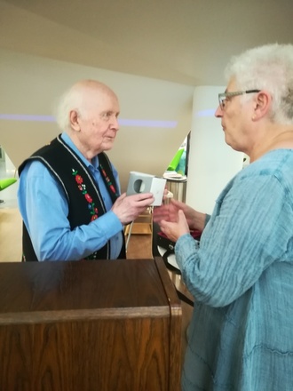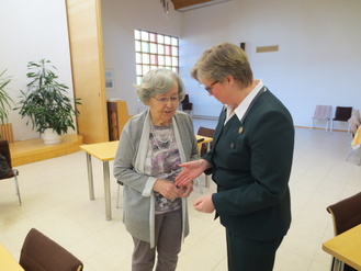 ![]() Kunniajäsen Solveig Siiropää | ![]() Liisa Sääksjärvi ja tekemänsä sotilaskotimerkki |