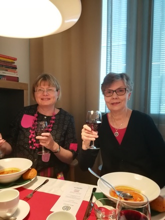Unkarilaista iltaa vietettiin 23.8. sanoin, musiikein, ruuin ja viinein. Suomi-Unkari -seurasta vieraina olivat Sirkka Uusipaikka, Pekka Ainali ja Arvo Saaristo, joita Leeni Leporanta kiitteli sotilaskotimukeilla. Unkarilaisen viinin ja alkuruuan kalakeiton äärellä Sanna Huuhka ja Riitta Jalava
