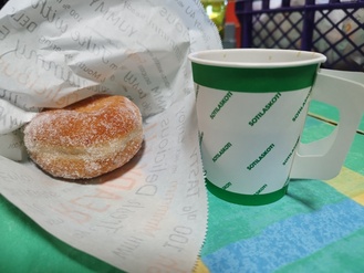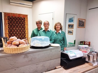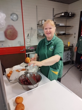Elokuun valapäivä on työntäyteinen myös sisarille. Puheenjohtaja hillottamassa munkkeja, joita Kristiina Nordman, Sanna Huuhka, Raili Huvinen ja Irmeli Villikka möivät valansa vannoneille varusmiehille ja heidän läheisilleen.