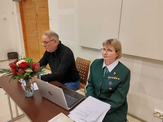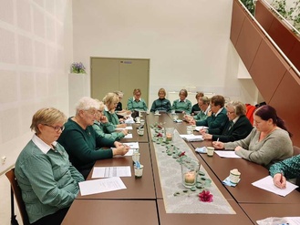 ![]() Kokouksen puheenjohtajana toimi Keijo Gärdström ja sihteerinä Teija Vanhala | ![]() Paikalla olleita vuosi- ja ansiomerkin saajia Kirsi Vinnikka, kunniajäsen Liisa Sääksjärvi, Anja Puustinen, Sanna Huuhka, Liisa Saarinen ja yhdistyksen puheenjohtaja Teija Laine |