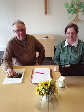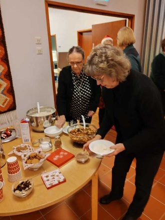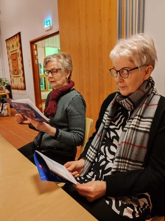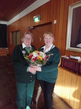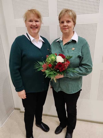 ![]() Puheenjohtaja Teija Laine kukitti uuden kunniapuheenjohtajan Liisa Sääksjärven | ![]() Puheenjohtaja-Teija ja 10-vuotismerkin saanut Liisa Saarinen |