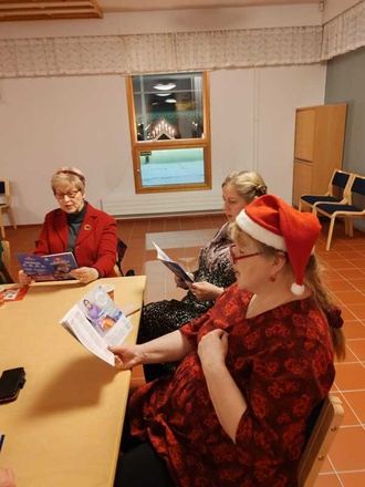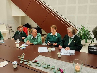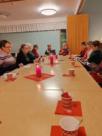 ![]() Kokouksen puheenjohtajana toimi Keijo Gärdström ja sihteerinä Teija Vanhala | ![]() Paikalla olleita vuosi- ja ansiomerkin saajia Kirsi Vinnikka, kunniajäsen Liisa Sääksjärvi, Anja Puustinen, Sanna Huuhka, Liisa Saarinen ja yhdistyksen puheenjohtaja Teija Laine |